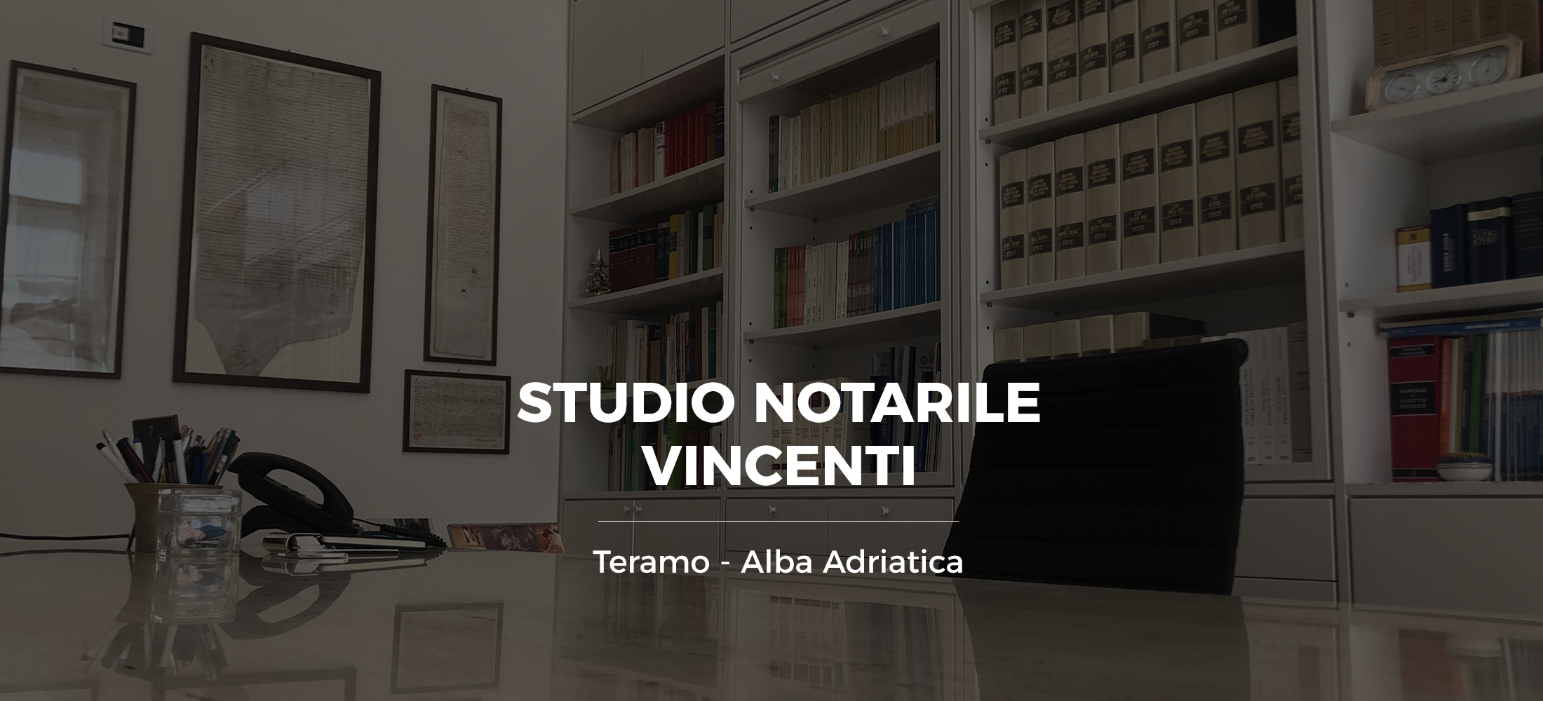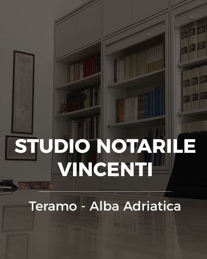 Lo studio notarile Vincenti ha competenza territoriale in tutto l’Abruzzo. Fondato nel 1972, ha la sua sede principale a Teramo, in Via Raneiro 5 e recapito ad Alba Adriatica (TE), in Via Olimpica 31.